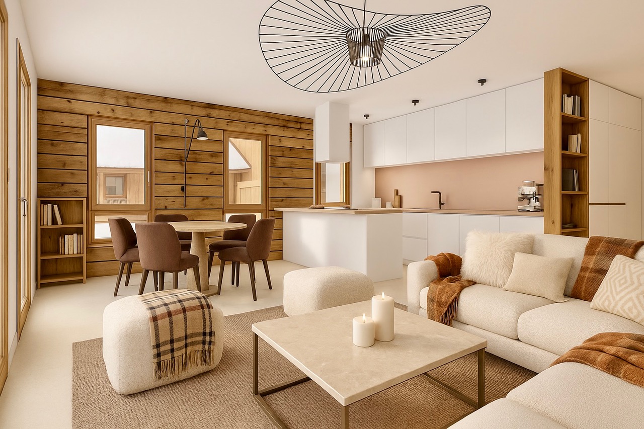 The apartment, scheduled for delivery in the second quarter of 2026, will be located in chalet D of the new Le Pratz residence, opposite the church square, as part of the creation of the village’s pedestrian center.