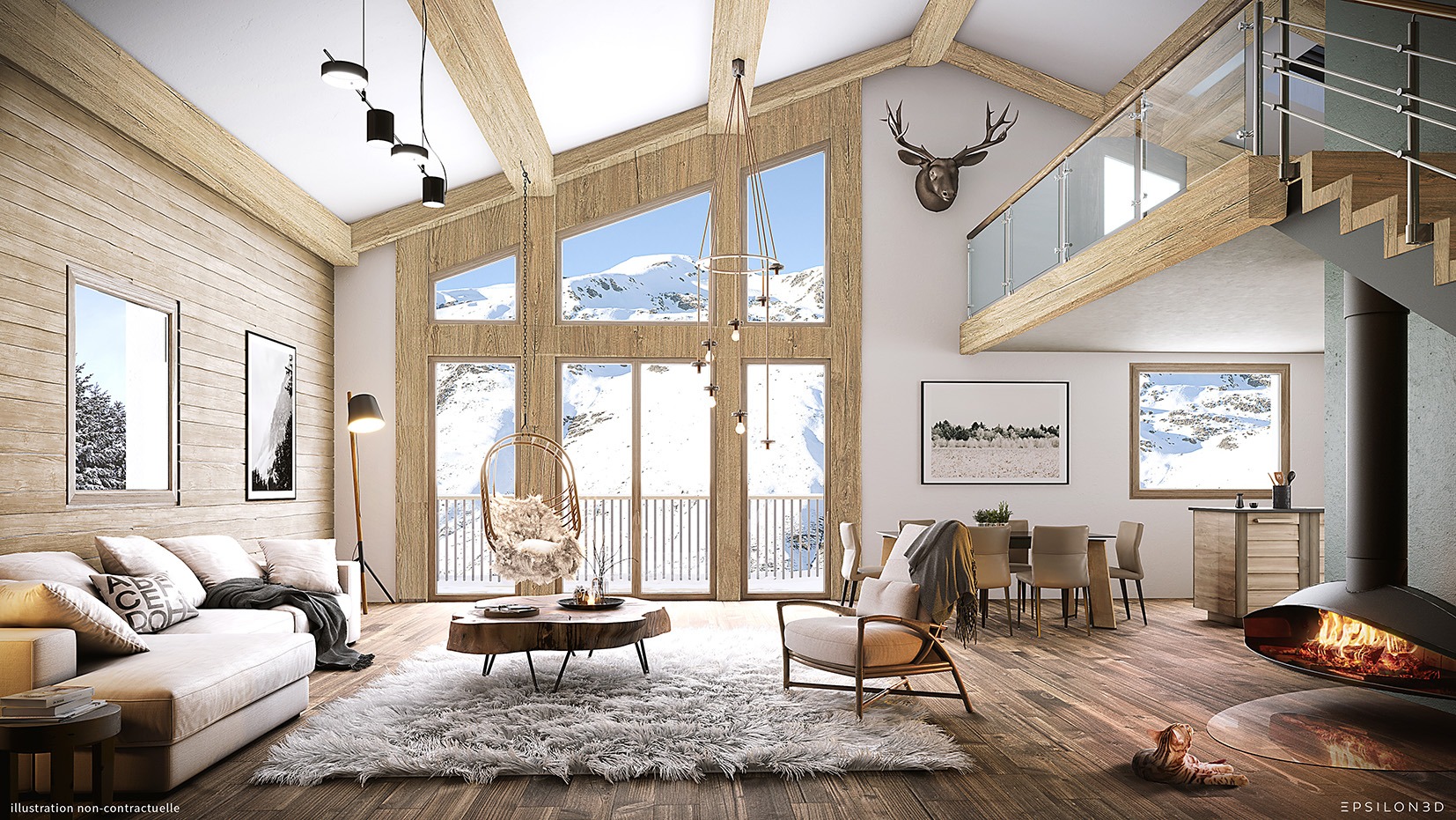 Le cœur de l’appartement s’articule autour d’une vaste pièce de vie, comprenant un séjour avec cuisine ouverte de près de 57 m², bénéficiant d’une belle hauteur sous plafond et de larges ouvertures. Un conduit de cheminée est prévu dans cette pièce, offrant la possibilité aux futurs propriétaires d’installer un poêle à bois. Cet espace convivial s’ouvre sur un balcon de 26 m² exposé plein sud, idéal pour profiter des vues dégagées à 180° sur les montagnes environnantes.