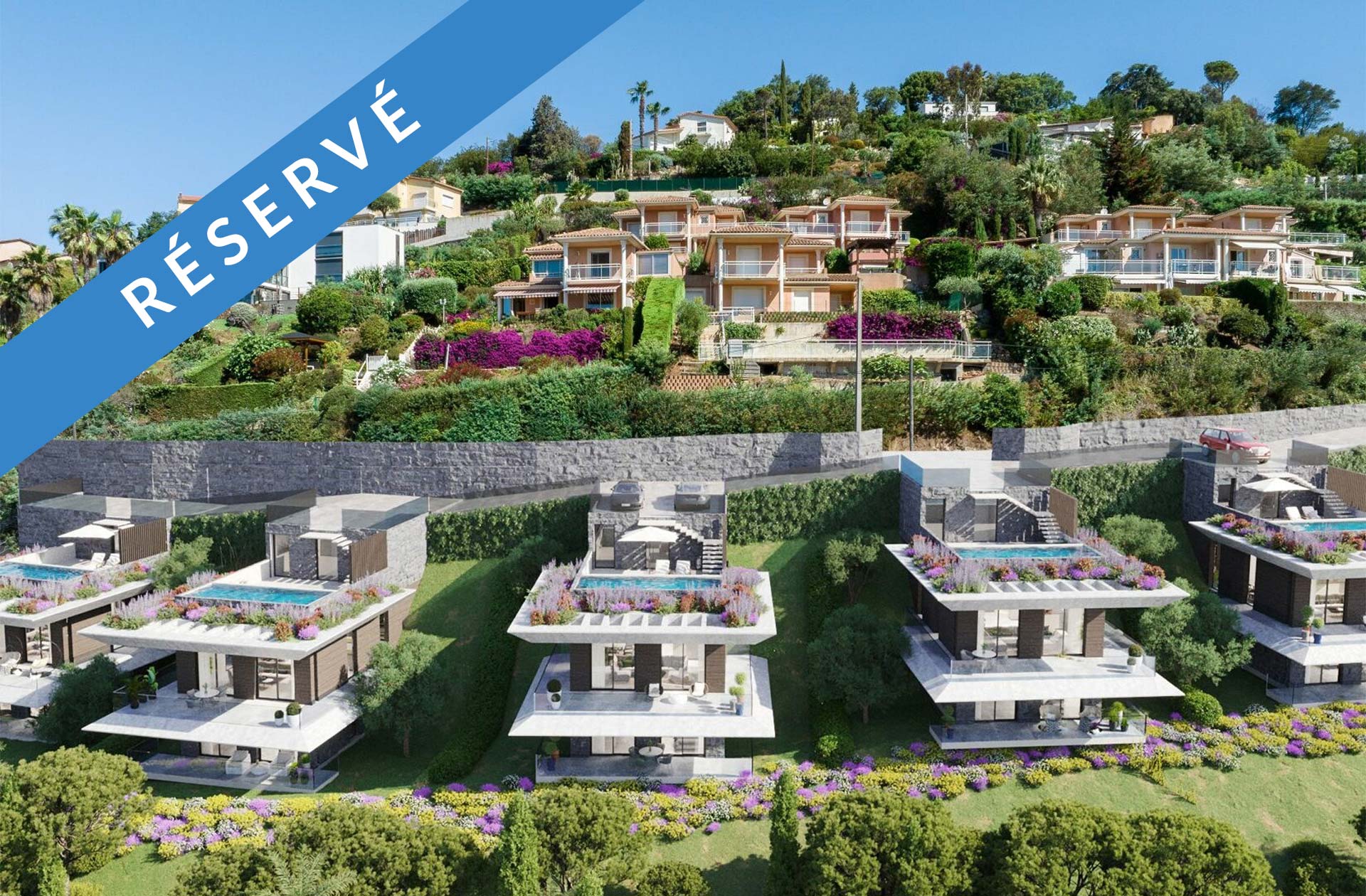 Construite à flanc de colline, la villa offre un espace de vie par niveau. Ainsi, l’accès de la villa se fait par le toit terrasse, qui ouvre l’espace entrée et détente comprenant une grande terrasse, prolongée par une piscine de 6,90 m x 2,50 m, le tout entourée par des essences méditerranéennes et bien sûr avec une vue mer imprenable.